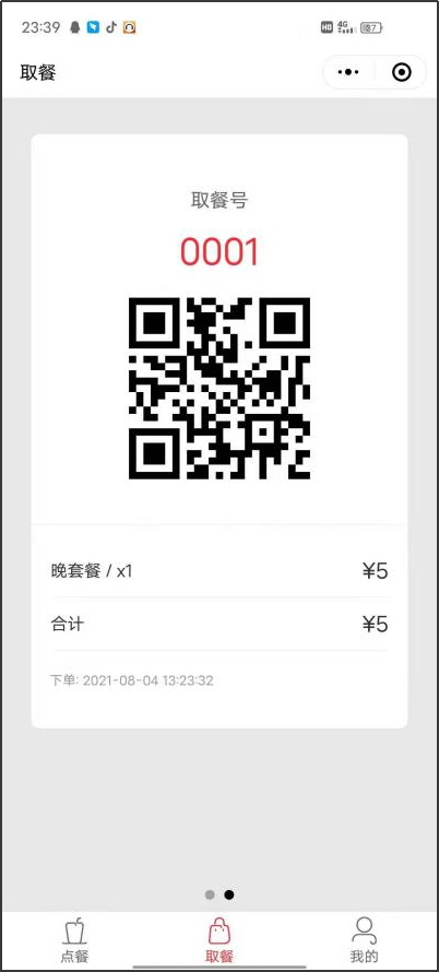 下单成功后系统生成取餐号、取餐核销二维码、点餐信息、费用合计、下单时间;